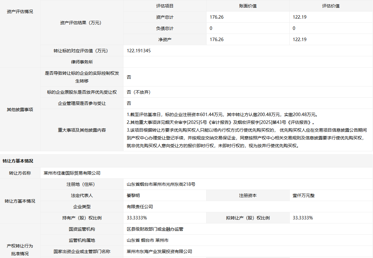 萊州市海之運(yùn)石油化工有限公司33.3333%國(guó)有股權(quán)