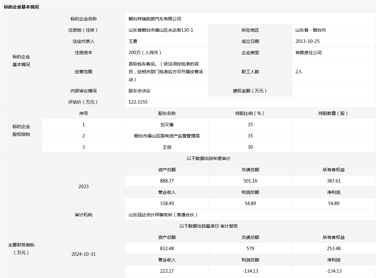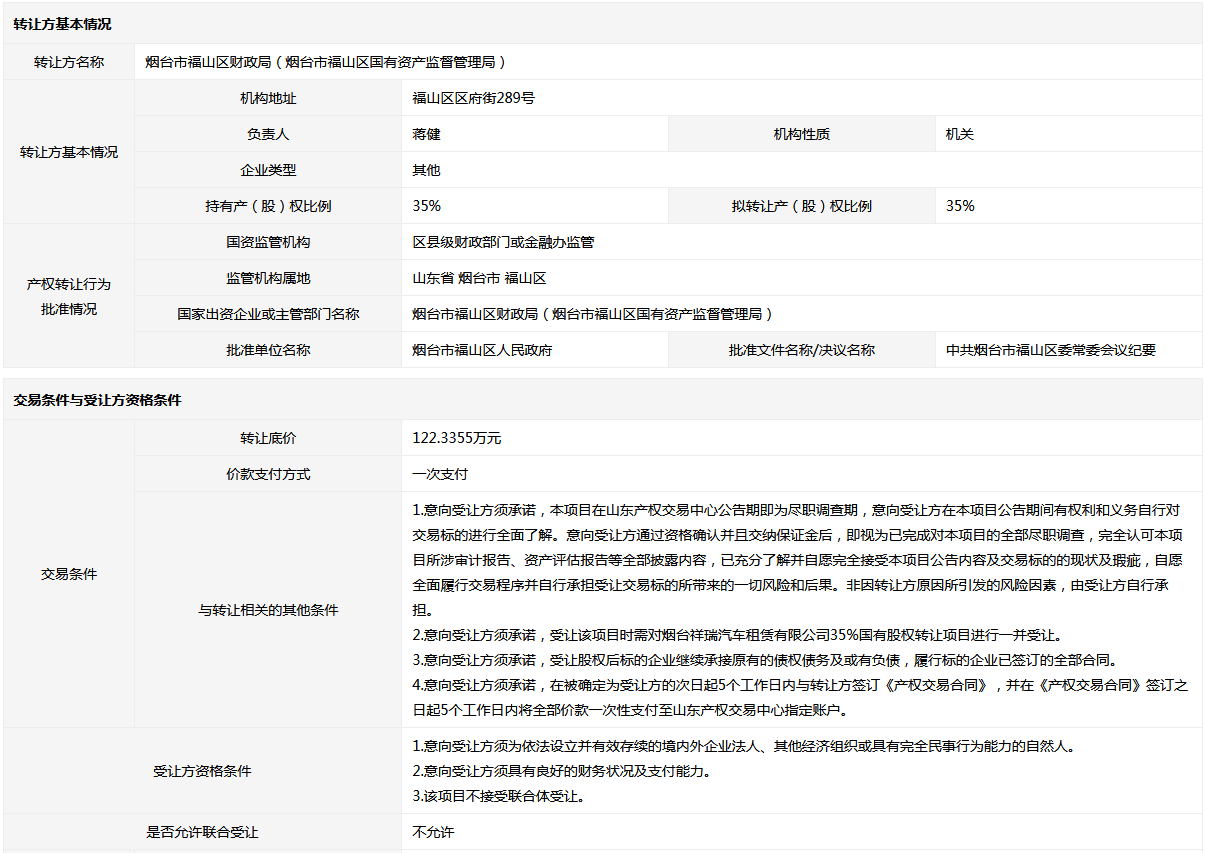 煙臺(tái)祥瑞旅游汽車有限公司35%國(guó)有股權(quán)