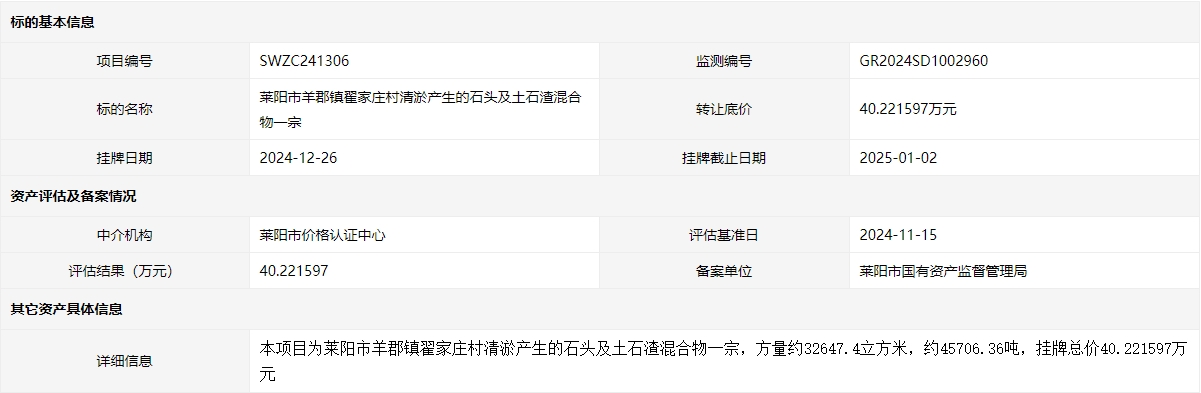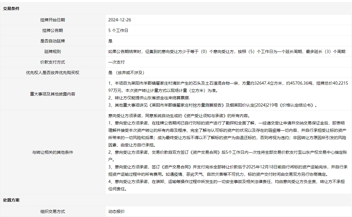 萊陽(yáng)市姜疃鎮(zhèn)西韓格莊村采礦產(chǎn)生大理石巖石頭及土石渣混合物一宗交易公告