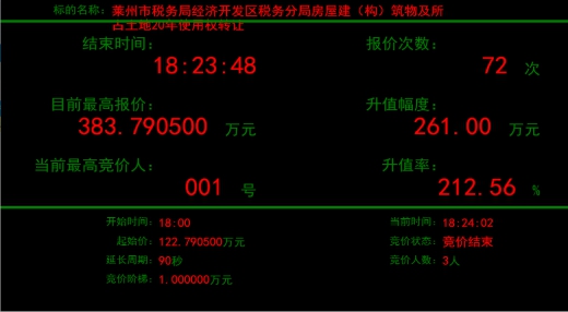 近日,萊州市稅務(wù)局經(jīng)濟(jì)開發(fā)區(qū)稅務(wù)分局所屬房屋建筑物及所占土地20年使用權(quán)轉(zhuǎn)讓項(xiàng)目在煙臺產(chǎn)權(quán)掛牌并有多個(gè)意向受讓方報(bào)名,最終,經(jīng)過72輪激烈報(bào)價(jià),項(xiàng)目較掛牌底價(jià)122萬元,增值261萬元,增值率高達(dá)212.56%,不但保證了疫情期間國有產(chǎn)權(quán)業(yè)務(wù)的正常開展,而且?guī)椭a(chǎn)權(quán)持有人實(shí)現(xiàn)了價(jià)值最大化。
